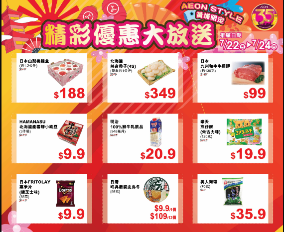 AEON Stores 精彩優惠大放送(黃埔店限定)推廣日期: 2022年7月22日至24日https://www.aeonstores.com.hk/promotion/download?id=2137&q[id_eq]=2137&f=file_chk