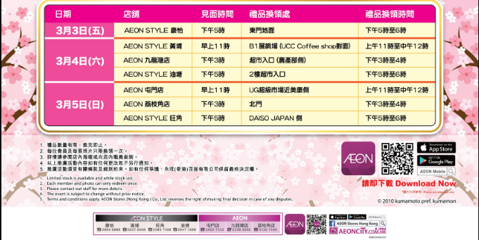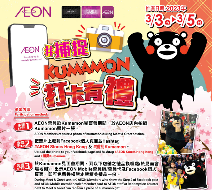 AEON Stores KUMAON 打卡有禮推廣日期:2023年3月3日至3月5日https://www.aeonstores.com.hk/promotion/download?id=2331&q[id_eq]=2331&f=file_chk