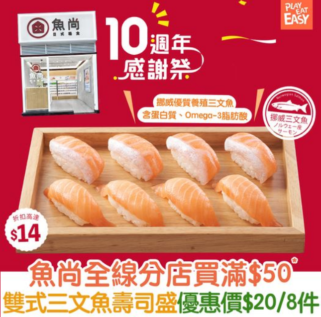 魚尚壽司踏入10週年,推出限時驚喜優惠,10月5日至11日期間,於全線分店買飯糰、壽司、卷物或日式便當等,每滿$50*, 可以週年優惠價$20購買「雙式三文魚壽司盛」一份* (原價$34/8件)。平咗$14,加餸好抵食