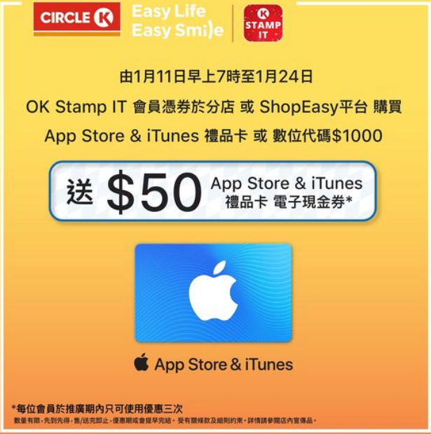 由1月11日至24日期間,OK Stamp IT會員憑券於分店或ShopEasy 網購平台 購買 App Store & iTunes $1000 禮品卡或數位代碼即送 $50 電子現金券! 每位會員於推廣期內可使用優惠3次 , 最高可享 $150 優惠~ 超抵! 電子現金券數量有限 ,送完即止。