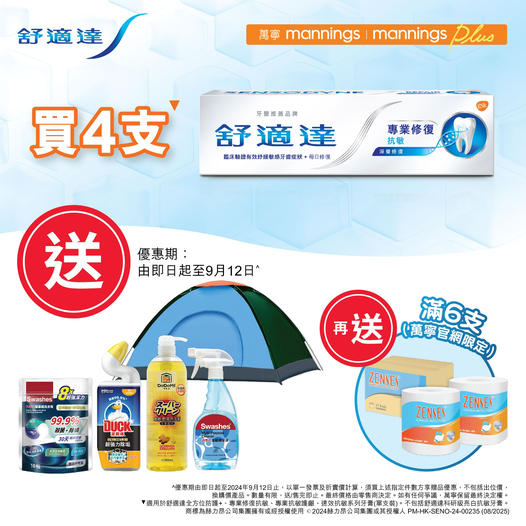 ^優惠期由即日起至2024年9月12日止,以單一發票及折實價計算,須買上述指定件數方享贈品優惠,不包括出位價,換購價產品。數量有限,送/售完即止。最終價格由零售商決定。如有任何爭議,萬寧保留最終決定權。
