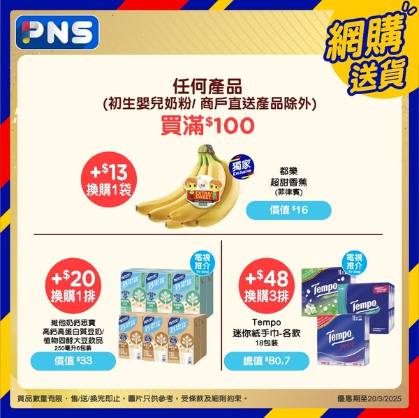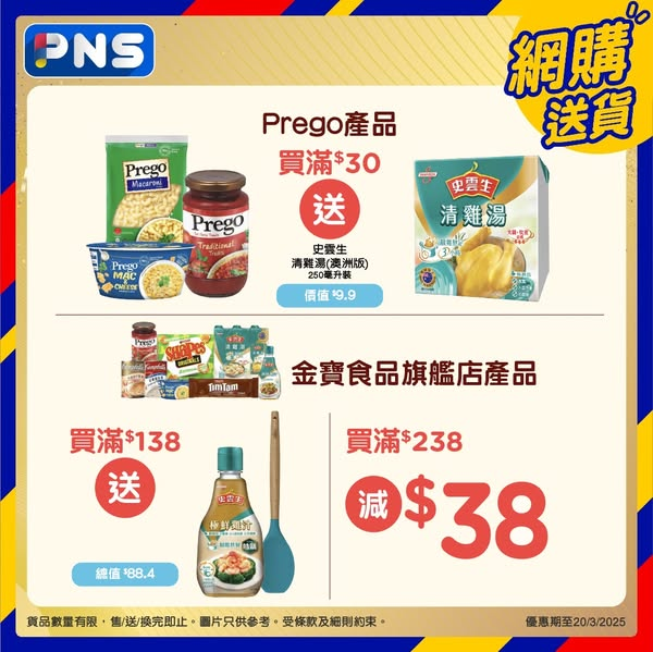 優惠期至2025年3月20日。換購及Prego優惠只適用於PNS網購。其他優惠適用於有售賣此貨品之香港百佳店舖及PNS網購。優惠以每張訂單計算。圖片只供參考。受條款及細則約束。