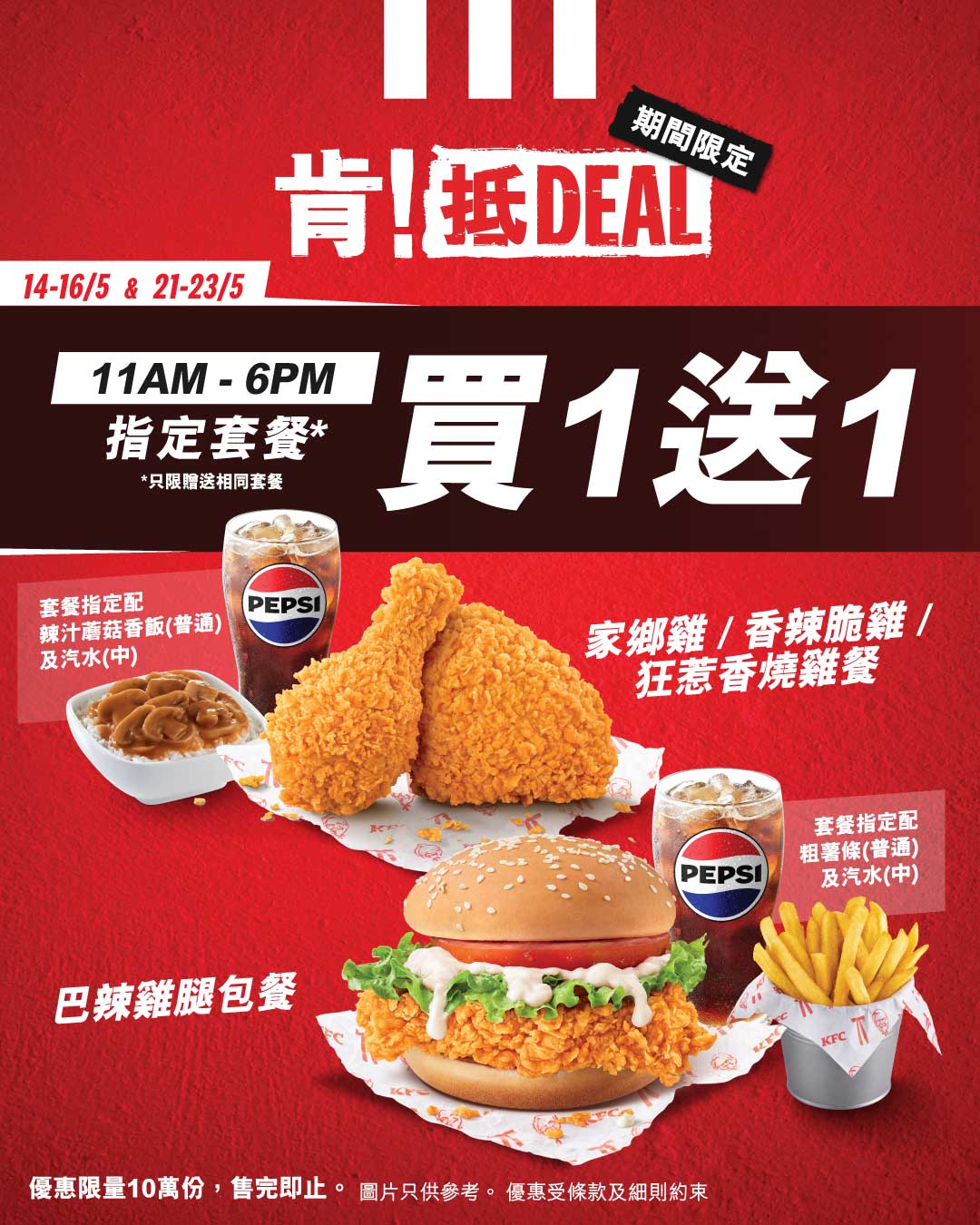 -買一送一優惠只適用於家鄉雞餐、香辣脆雞餐、狂惹香燒雞餐及巴辣雞腿包餐。