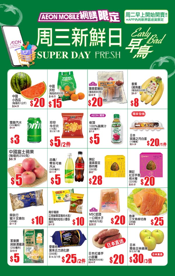 送貨每單將收取$2包裝費,其中包括塑膠購物袋徵費 <詳情請參閱 AEON Mobile網購