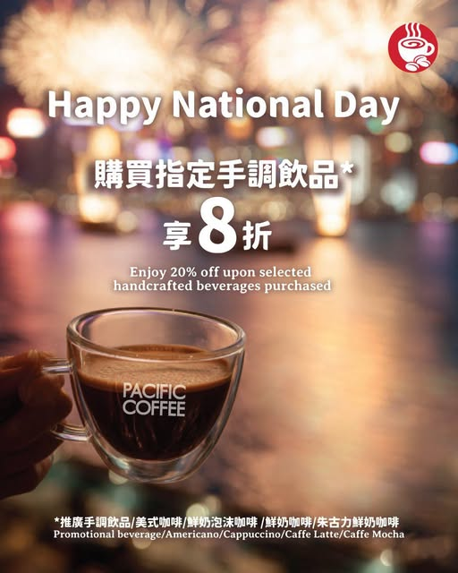 於10月1日當日黎Pacific Coffee 購買指定手調飲品*,即享8折優惠立即mark低日子,一齊舉杯慶祝~*指定手調飲品Selected handcrafted beverages:推廣飲品/美式咖啡/鮮奶泡沫咖啡/鮮奶咖啡/朱古力鮮奶咖啡*優惠須受有關條款及細則約束 :http://bit.ly/4q35tXh