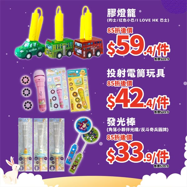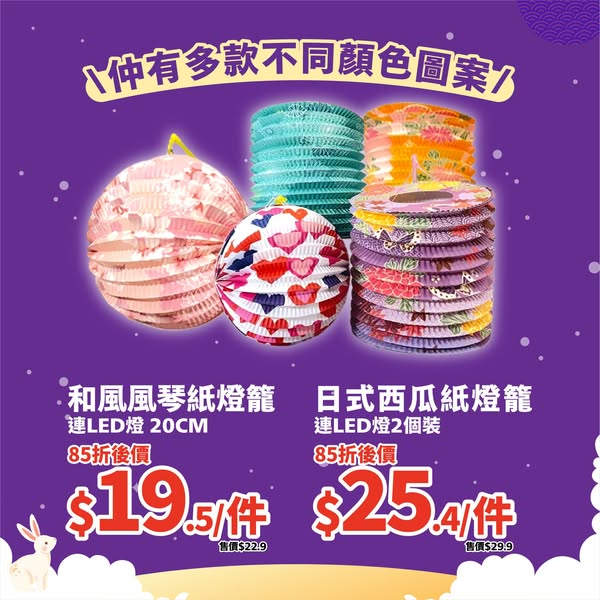 精選中秋燈籠85折仲有幾日就係中秋節啦快啲嚟日本城揀靚靚燈籠賞月啦多款可愛款式仲有投射功能大人同小朋友都實鍾意仲有多款發光精品等你發掘即刻嚟門市睇款式開心過中秋全場商品買4送1全線日本城門市、易購點及「一CLICK即日拎」同步優惠即刻嚟掃貨啦網店「自取或送貨 - 倉庫/ 供應商派貨」獨家優惠購買5件商品滿$120即享85折*優惠受條款及細則約束*款式視乎店舖供應*數量有限,售完即止*圖片只供參考