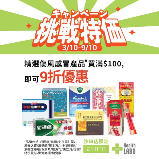【3/10 - 9/10 超お!沙田限定「Health LABO」專區挑戰特價】轉季時節,忽冷忽熱嘅天氣好容易感冒,除咗保持良好嘅個人同環境衞生外,記得買定啲傷風感冒藥看門口。今個星期嚟沙田「Health LABO」專區入手指定傷風感冒產品*買滿$100,,即享折優惠,快啲嚟選購有備無患!*品牌包括:必理痛/幸福/北京同仁堂/漁夫之寶/清熱酷/農本方/小林退熱貼/京都念慈菴/保濟丸/維克司/使立消/橙樹/特快靈/非洲海底椰/龍角散--- 「Health LABO」專區挑戰特價 ---日期︰即日至10月9日地點︰一田沙田店「Health LABO」專區數量有限,售完即止