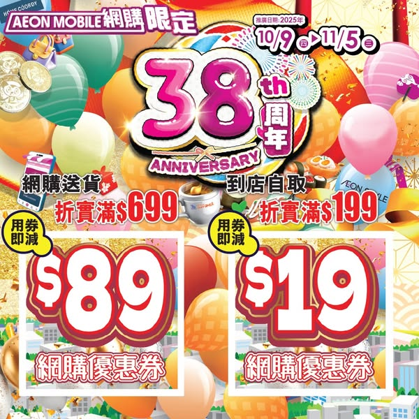 「AEON 38周年呈獻」送你2張網購優惠券可即減高達$89