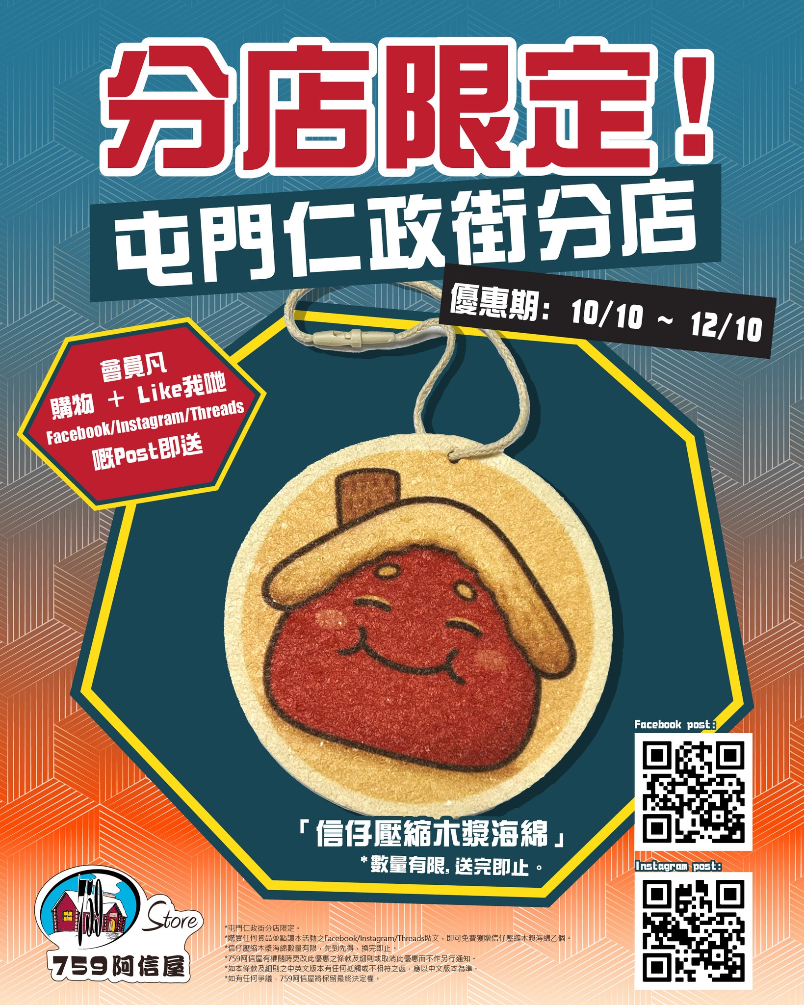 2)會員凡購物 + Like我哋Facebook/Instagram/Threads 嘅Post 即送信仔壓縮木漿海綿乙個。