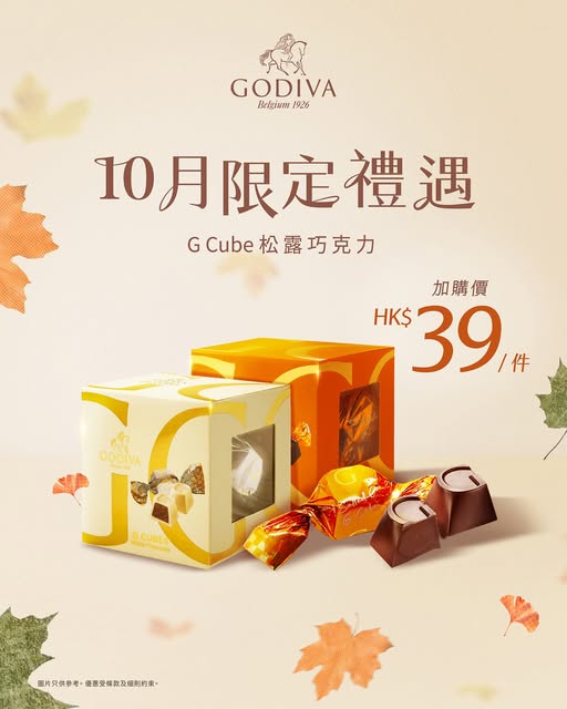【10月限定禮遇】秋意漸濃,需要一口甜蜜點綴 現於GODIVA專門店購物,即可以優惠價HK$39加購G Cube松露巧克力 (原價HK$59/盒)*!G Cube 松露巧克力香脆巧克力外殼包裹各種濃郁内餡,五款口味包括:海鹽焦糖金巧克力草莓紅寶石巧克力榛子白巧克力黑巧克力牛奶巧克力立即親臨 #專門店 選購!*優惠受條款及細則約束