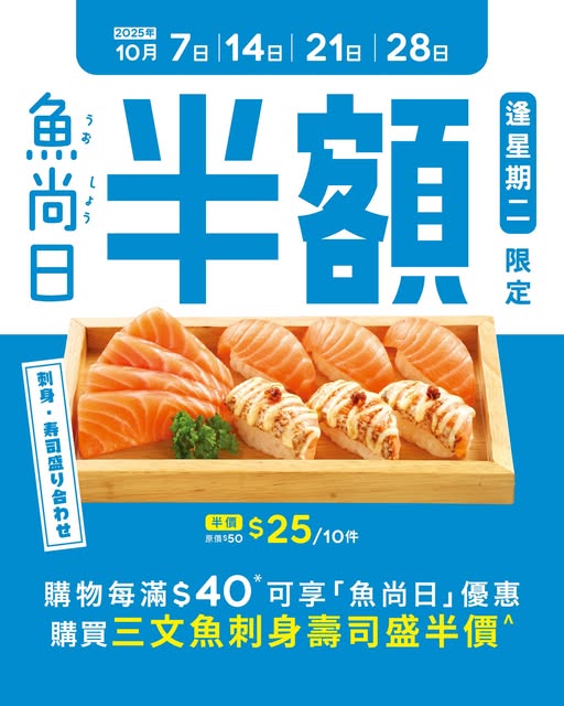 10月逢星期二購物每滿$40*,可享「魚尚日」優惠, 半價購買全新人氣限定三文魚刺身壽司盛^