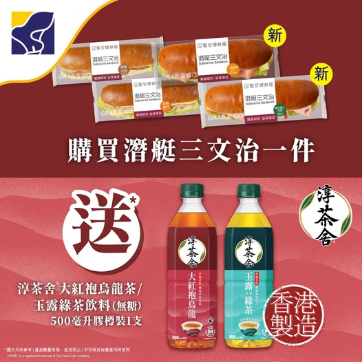 ! 10月13日至17日期間,凡以正價購買潛艇三文治一件, 即送你淳茶舍大紅袍烏龍茶或玉露綠茶 500ml 一支!