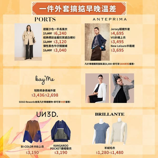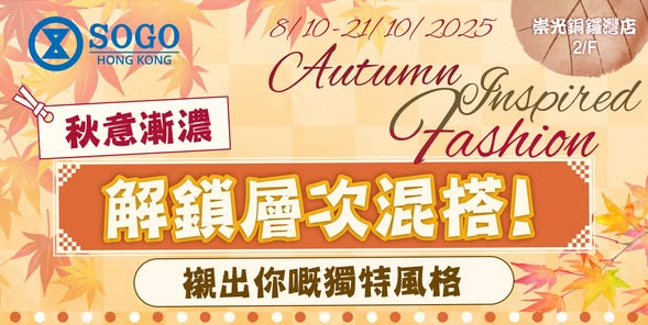 【秋意漸濃解鎖層次混搭】天氣開始轉涼,係時候用層次混搭襯出專屬你嘅秋日造型!即日起至 21/10/2025,崇光銅鑼灣店 2/F 女士服裝部為你準備好一系列保暖又有 style 嘅時尚單品,由外套到頸巾、飾物同手袋,隨心 mix & match,散發你獨有嘅魅力www:csteam@sogo.com.hk