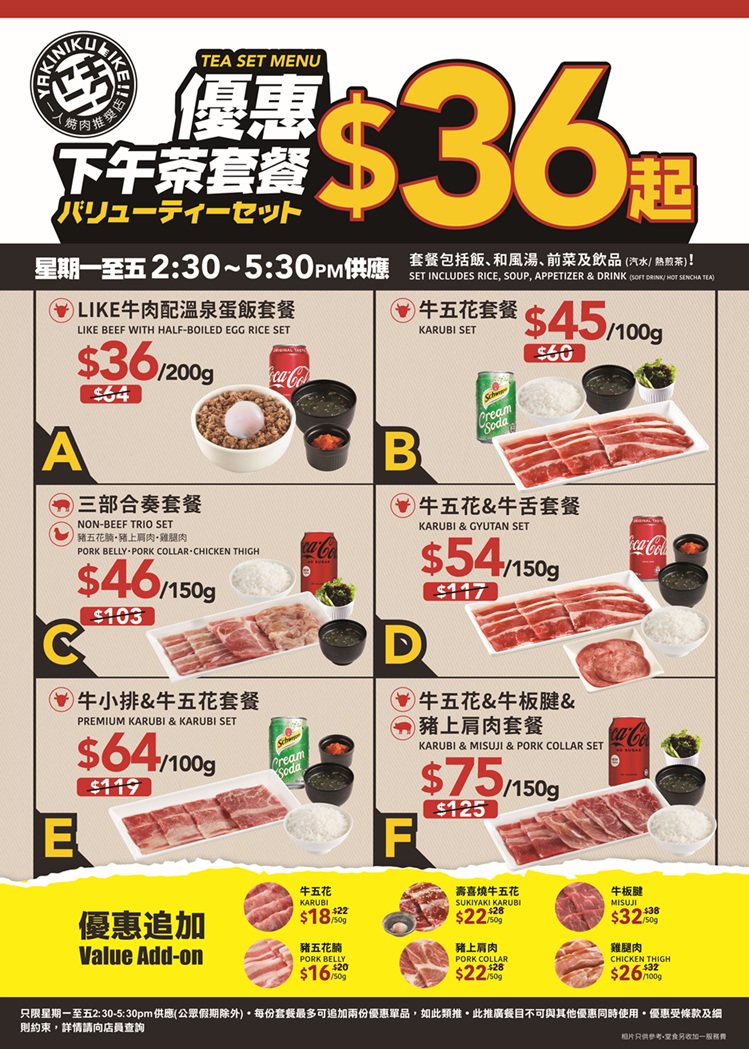 忙到無時間食lunch?有「燒肉LIKE」back you up!平日星期一至五限定的優惠下午茶套餐於全線分店適用,共6款套餐選擇,豬、牛、雞通通齊!最平「LIKE牛肉配溫泉蛋飯套餐」只需$36,隨時平過茶記茶餐!還有新增「牛五花 & 牛板腱 & 豬上肩肉套餐」,選擇更多更滿足,燒肉迷午後忙裡偷閒、鬆一鬆之選!