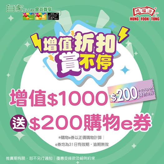 【增值折扣賞不停】增值送$200購物e券由即日起至10月31日,會員於分店單一增值$1,000,除10月增值優惠外,額外再送$200購物e券*1張!*購物e券只限購買正價產品,公價產品恕不適用│e券均為31日有效期,逾期無效優惠受條款及細則約束,詳情請向店員查詢。