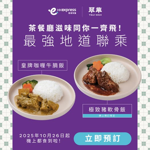 茶餐廳經典風味唔單止味道令人回味無窮,仲係一種回憶。地道滋味陪你開展新旅程,預訂機票同時加購以上聯名餐點,優惠價低至港幣 58*!其他新餐點都開始接受預訂,10月26日 之後就可以喺UO航班嘆到喇!
