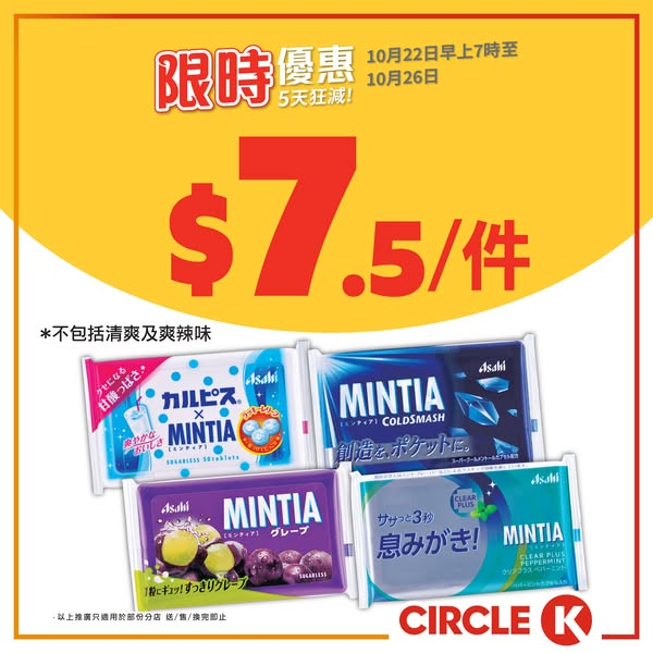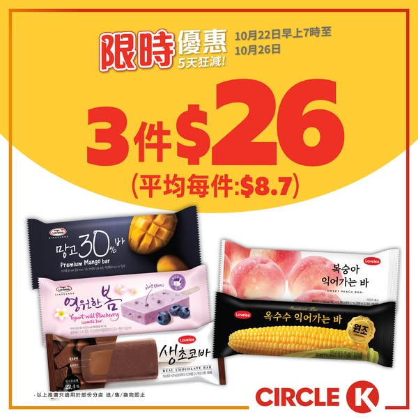 【5天狂減】限時優惠嚟喇!.趁天氣仲未太凍!把握仲可以食雪糕嘅日子,即刻嚟掃貨啦!今期雀巢甜筒超抵價,平均每件都只係$7.5!另外仲有Lavelee雪糕批優惠!除咗雪糕外,記得睇埋其他啤酒,飲品,零食優惠啦!一樣咁著數!. 雀巢甜筒(各款) (不包括奶油啤酒味) 9件$68(平均$7.5/件)LAVELEE雪糕批 (各款) 3件$26(平均$8.7/件) ASAHI MINTIA無糖薄荷糖50粒(冰爽/清新/可爾必思/巨峰提子味) $7.5/件維他新鮮茶480毫升(各款) $9/件寶礦力500毫升 (各款) 2件$19.5(平均$9.8/件) 嘉士伯啤酒500毫升 4 罐裝 $28/件 七寶札幌啤酒500毫升 $8/件. 推廣日期:10月22日早上7時至10月26日. 優惠須受條款及細則約束,詳情請參閱店內海報 購買及飲用啤酒人士必須年滿18歲