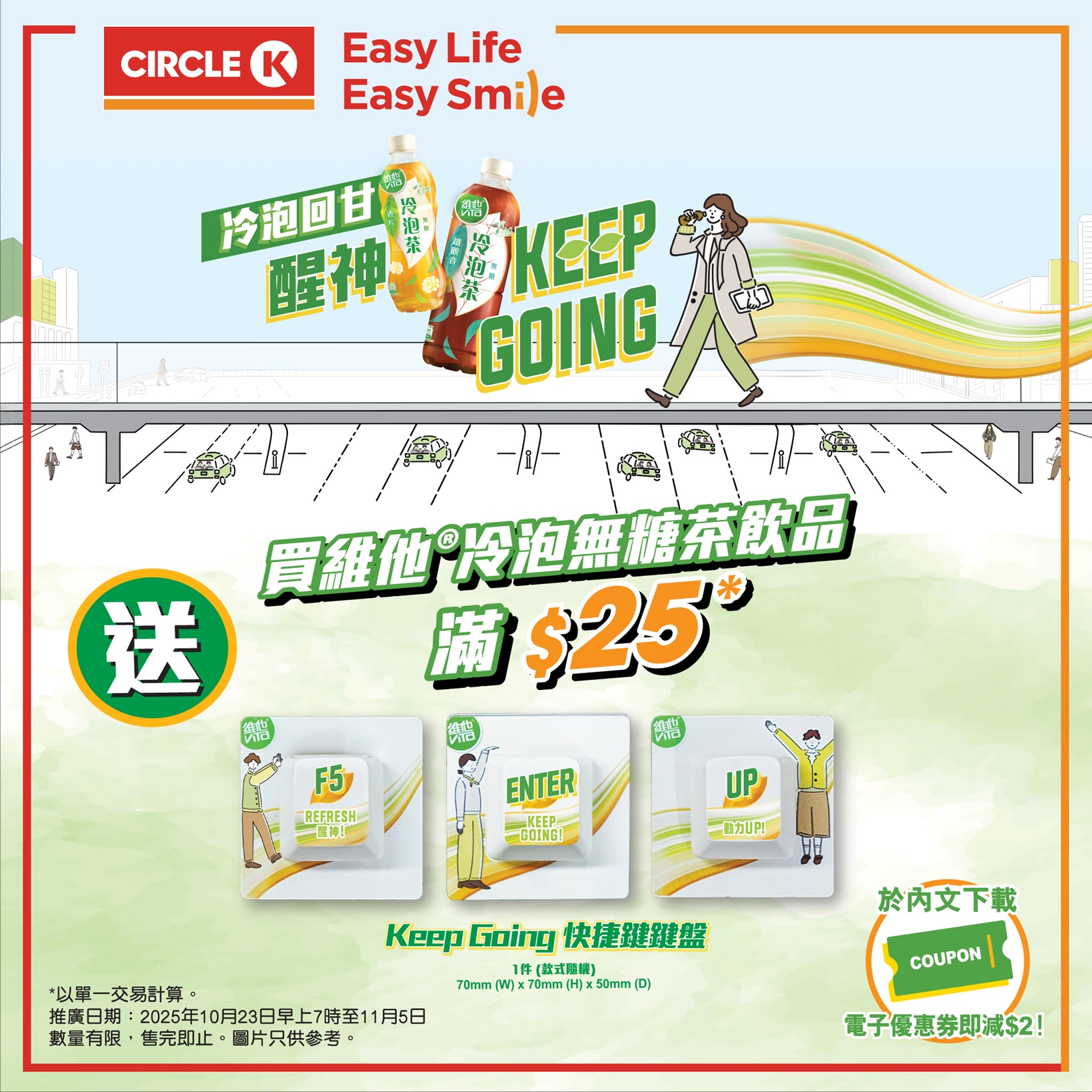 ,凡於OK便利店購買維他冷泡無糖茶飲品滿$25*,即送 Keep Going 快捷鍵鍵盤盲盒1件