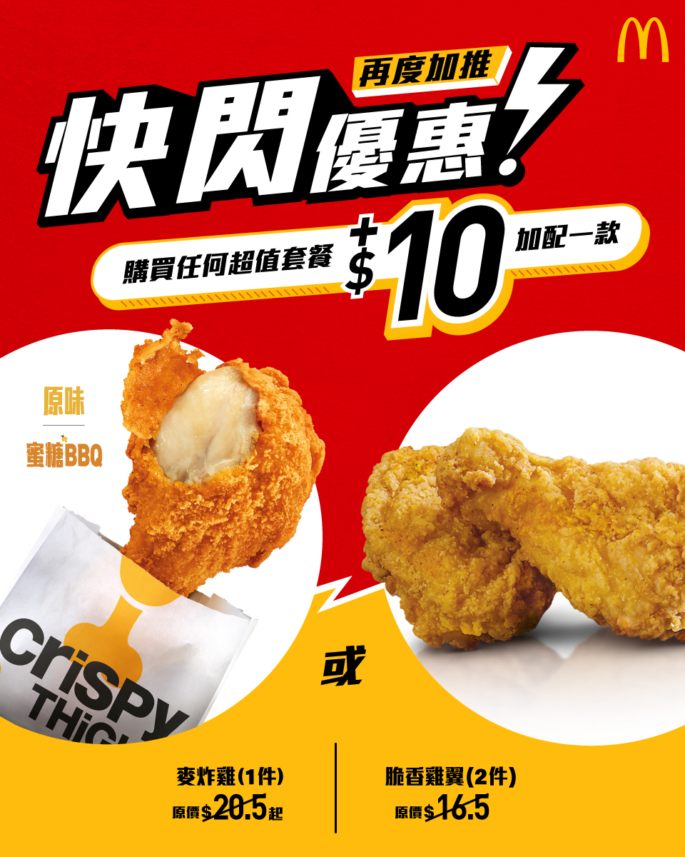 10月23日起,麥當勞再度推出快閃至「脆」優惠—買任何超值套餐,加$10就可以歎埋以下