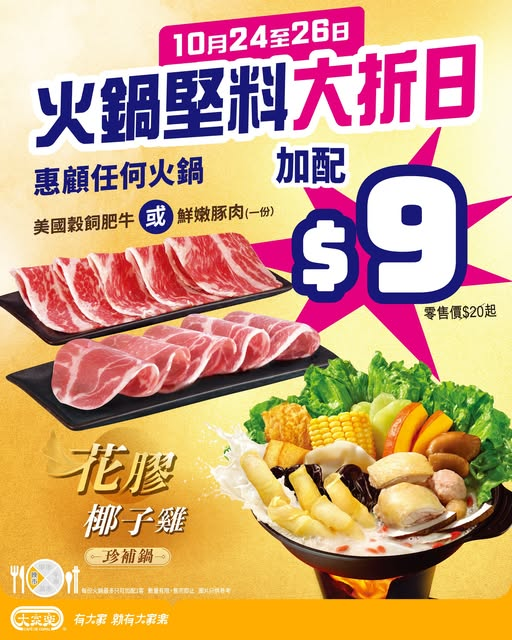 大家樂火鍋堅料大折日丨$9️⃣加配美國穀飼肥牛/鮮嫩豚肉!