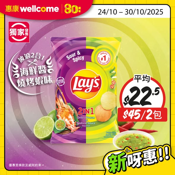樂事 波浪2合1海鮮醬燒烤蝦味薯片 優惠價$45/2包,平均$22.5/包泰式風味襲港!波浪厚切,雙倍酥脆,泰式海鮮醬嘅鮮甜 + 燒烤蝦嘅香濃,風味2合1完美結合!