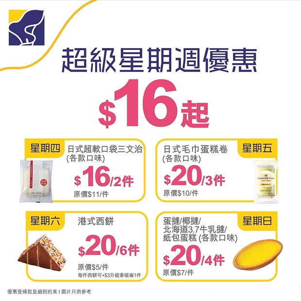 逢星期日:$20購買4件蛋撻/椰撻/北海道3.7牛乳撻/紙包蛋糕 原價:$7/件** 優惠受條款及細則約束