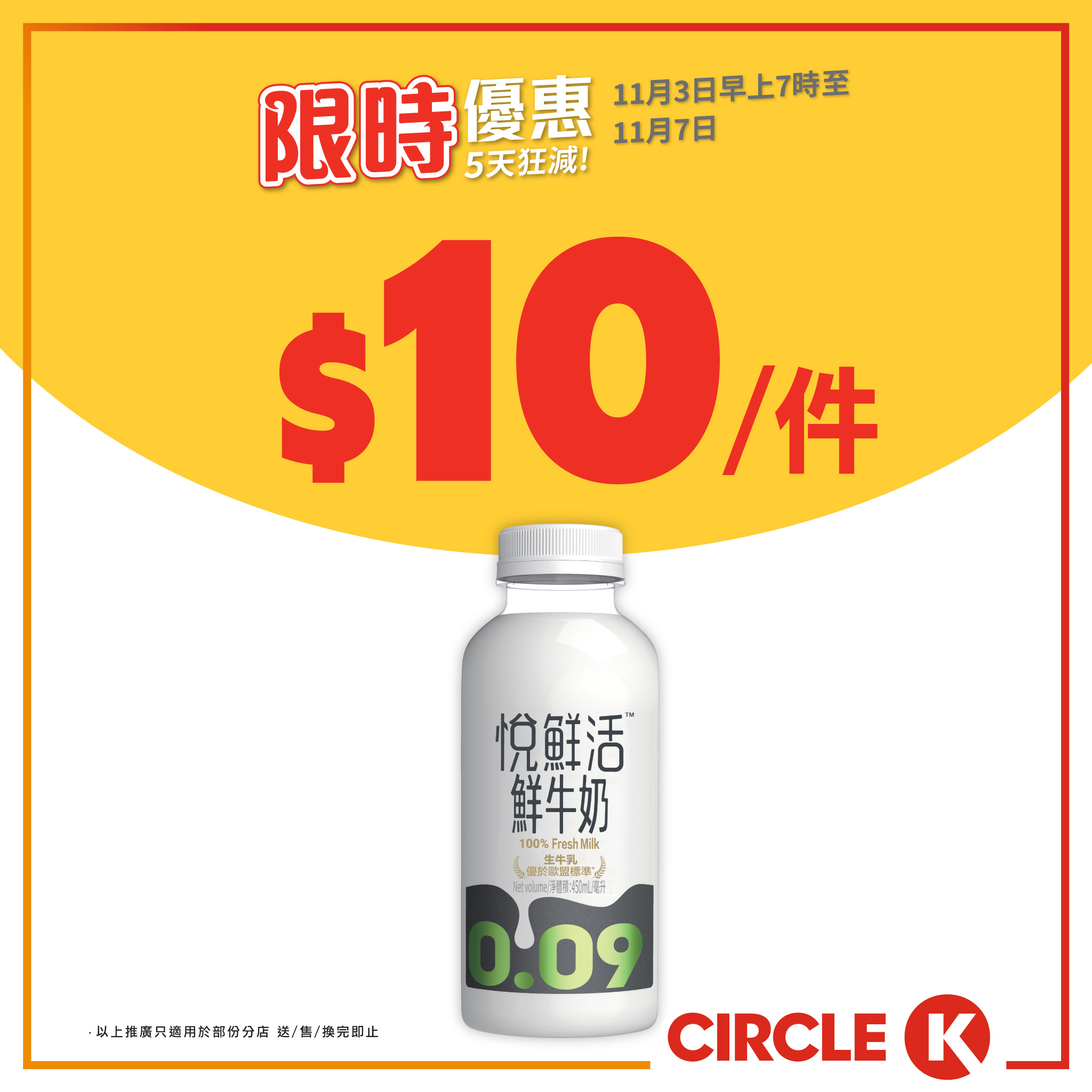 【5天狂減】悅鮮活鮮牛奶450ml 限時優惠悅鮮活鮮牛奶奶味濃郁,100%鮮牛奶 早餐、運動後補充都啱! 5天限時優惠,只需$10/件! 即刻嚟Circle K入手啦!悅鮮活鮮牛奶 450毫升-$10/件推廣日期:11月3日早上7時至11月7日#CircleK #OK便利店 #悅鮮活 #鮮牛奶 #限時優惠