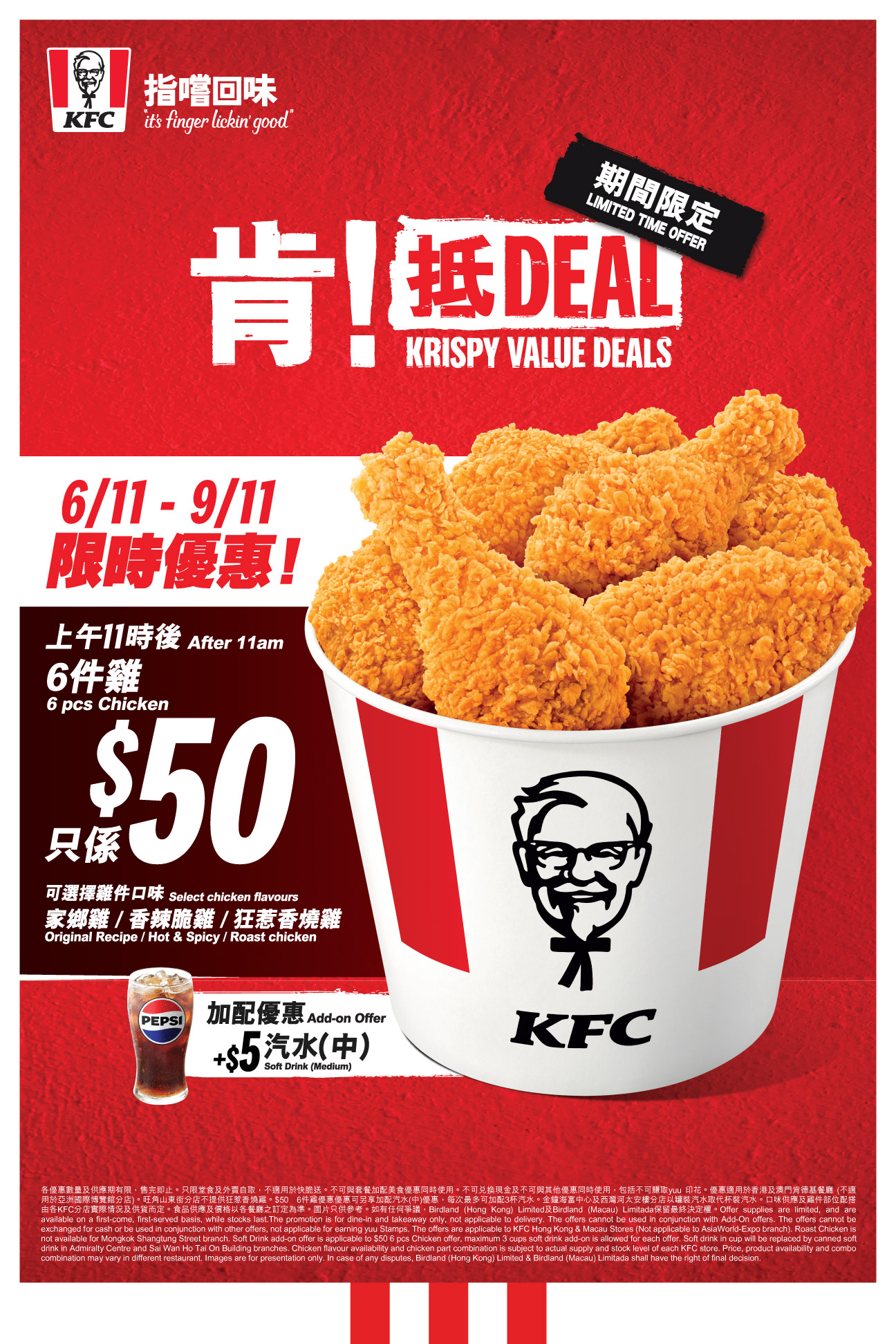 KFC「肯!抵DEAL」11月優惠火熱來襲!由2025年11月6日(四)至11月9日(日),KFC為您獻上4天限定驚喜優惠「$50 6件雞」!外皮酥脆、肉質滑嫩多汁的炸雞,無論是與親朋好友分享,還是獨自品嚐,都能讓您盡享美味!