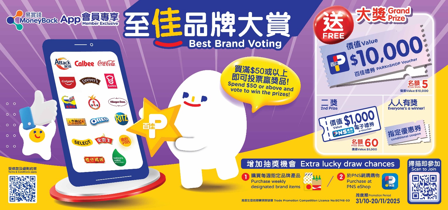 「至佳品牌大賞」由即日起至2025年11 月 20 日期間舉行,易賞錢會員只要於全線香港百佳門市及旗下品牌或PNS網店單次購物滿 HK$50 或以上,並登入至promotion.pns.hk/登記,即可從候選品牌中分別投選10 個百佳「至尊超市品牌」及10 個「至尊家庭品牌」,支持心目中最佳品牌,完成投票即可參加抽獎!而購買每週指定品牌產品,或於PNS網購購物滿 $50更可獲額外抽獎機會,即單次交易最高可獲3次抽獎機會,讓中獎機會大增!