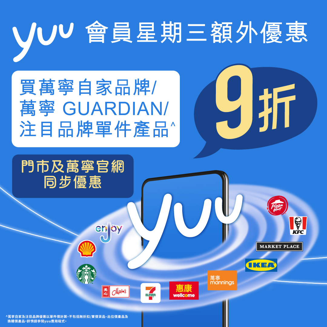 提示:萬寧現金優惠券不能於yuu折扣日、enJoy咭日、yuu會員星期三額外優惠日或其它優惠日及時段使用。