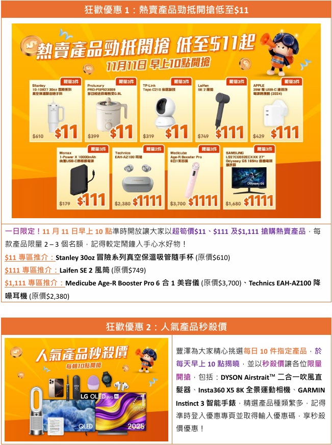 為增添購物樂趣,豐澤網店於推廣期內每日上演驚喜優惠大放送!狂歡優惠包括 (1) 雙11一日限定的「熱賣產品勁抵開搶低至$11」,$11、$111及$1,111超抵價讓大家快搶好物、 (2) 「人氣產品秒殺價每日準時開搶」每日精選10大秒殺價產品、 (3) 「11大品牌補貼優惠」熱門品牌雲集為豐澤網店帶來限定補貼優惠、 (4)「折上折禮包大激賞」加碼為10大產品類別提供折上折優惠碼、 (5) 「每日隨機即搶限量優惠碼」享高達5折優惠、以及 (6) 於購物節期間帶來「過千件激減低至11折」,總有一款優惠產品合你心水,快趁折扣滿瀉的雙11來豐澤網店盡慶購物狂歡!