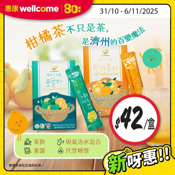 ,唔好錯過多款新登場嘅產品!今期惠康有JejuNFarm柑橘/青桔茶、飛雪礦物質水及BPJ 蛋白棒,快啲嚟入貨啦