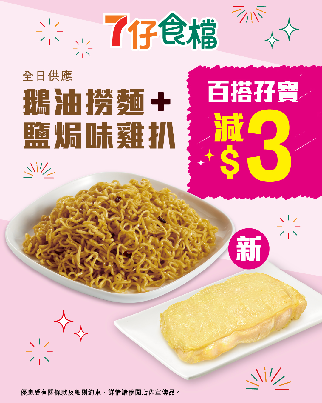 嚟緊一連兩星期憑電子優惠券買7仔食檔「鵝油撈麵百搭孖寶」套餐即減$3📣只需$24蚊就可以食到啦(原價$27) ❗️每份套餐含鵝油撈麵1份配紫/ 綠點小食1 款❗️🤤鹽焗味雞扒就係綠點啦✨襯機會一次過試齊兩款新美食啦❗️