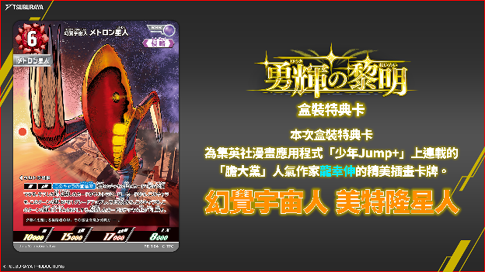 《膽大黨》是一部融合靈異戰鬥與青春成長元素的漫畫,自推出以來累積銷量突破 1000萬本。本次合作旨在充分發揮此作品的極高人氣,由龍幸伸老師繪製全新原創插畫,以描繪 美特隆星人在黃昏時分穿梭於城市之中的景象。凡購買一盒 24包裝的「黎明的光輝」卡牌,即可獲得此獨家特典宣傳卡,以慶祝超人力霸王卡牌遊戲一週年。