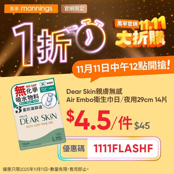 1折筍貨優惠碼【1111FLASHF*】Dear Skin親膚無感Air Embo衛生巾日/夜用29cm 14片