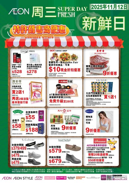 指定特許銷售商仲有周三新鮮日優惠,只係特定分店有架咋,快d黎AEON睇睇啦!