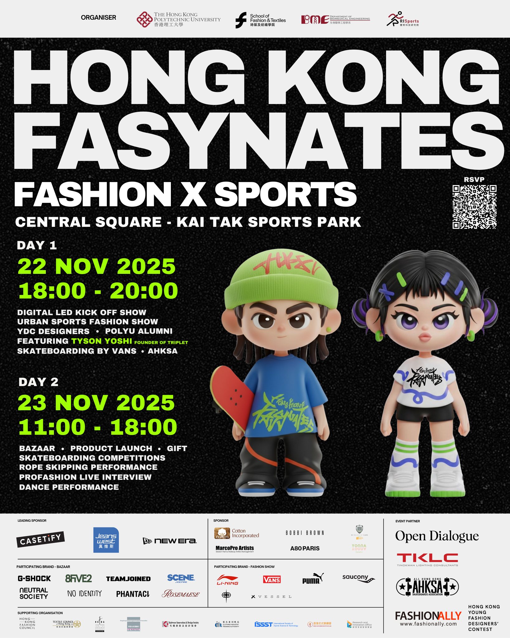 由香港理工大學(理大)時裝及紡織學院、生物醫學工程學系及體育科技研究院首次聯合主辦的全新時尚運動跨界盛會「HONG KONG FASYNATES 2025:時尚x運動」,將於2025年11月22日至23日假啟德體育園中央廣場盛大舉行。