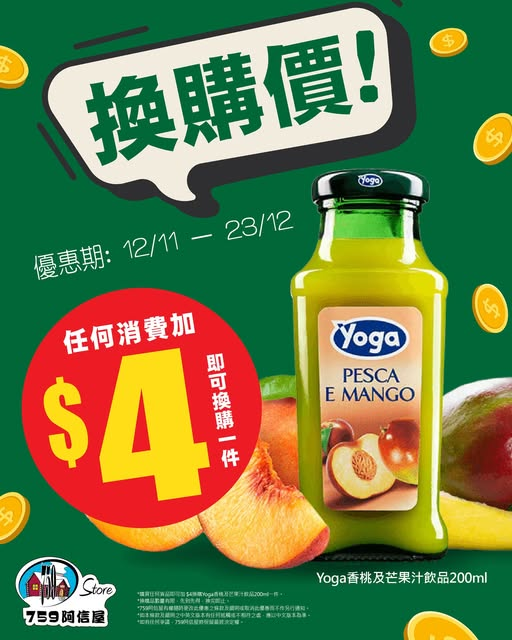 】凡任何消費加 $4 即可換購一件!*購買任何貨品即可加 $4換購Yoga香桃及芒果汁飲品200ml 一件。