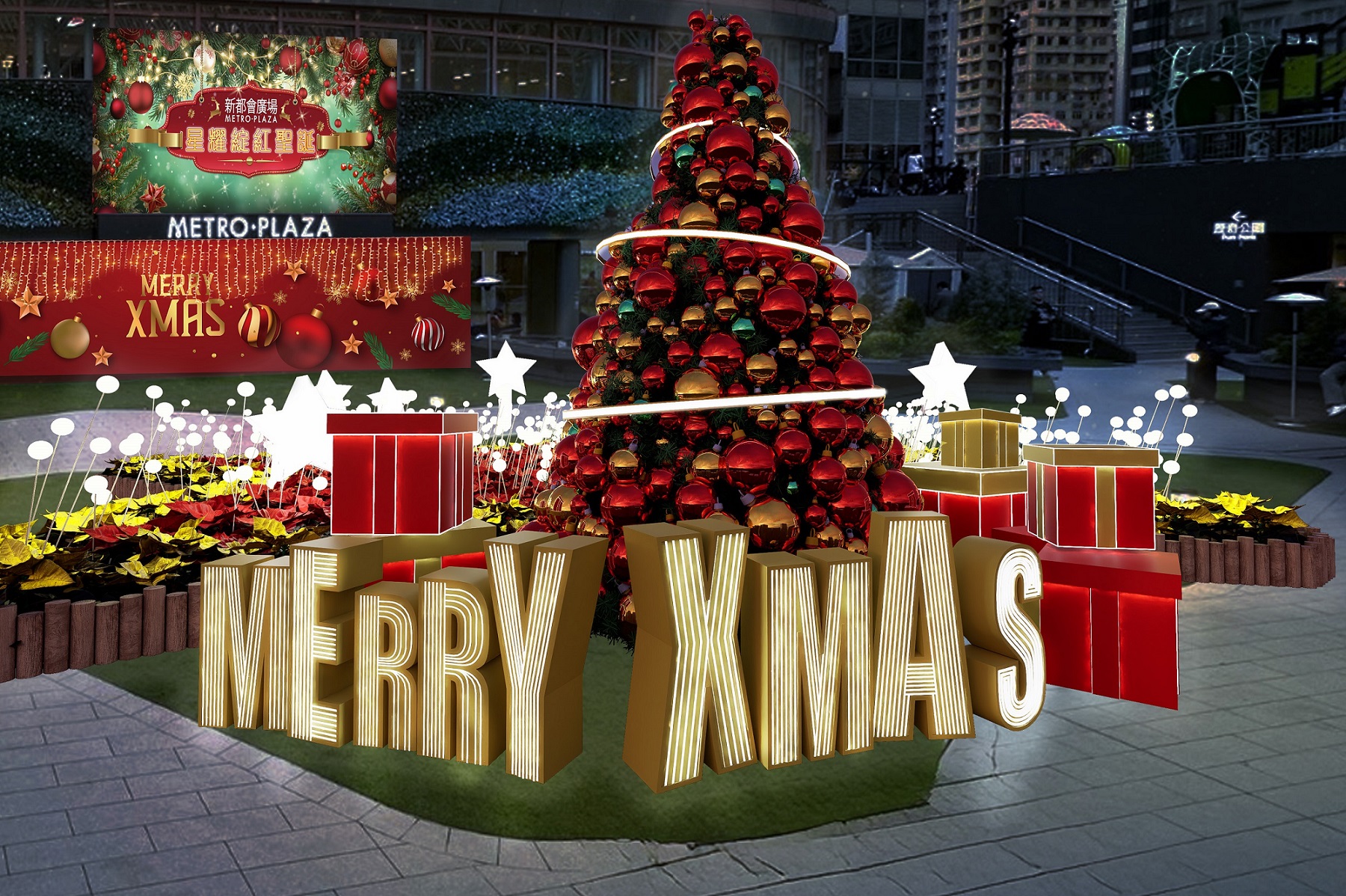 Christmas」燈牌搭配炫目的禮物盒,散發著溫暖的節日祝福。每一個角落都是絕佳的打卡點,讓你夢幻出鏡!