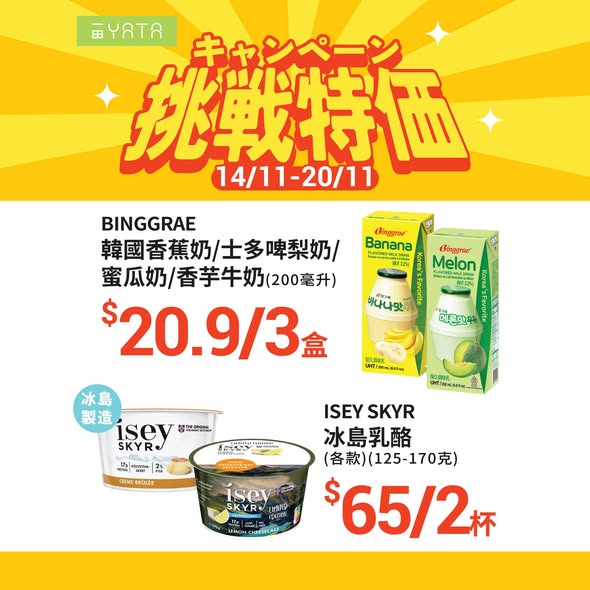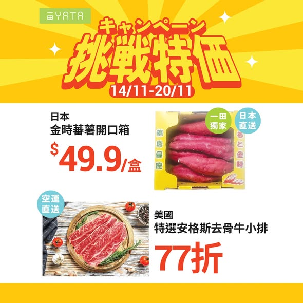 【14/11 -20/11 超お!挑戰特價】天氣轉涼,食慾回歸,食肉獸模式on!「挑戰特價」幫你慳住食得好,今朝精選食材通通靚價入手,有美國安格斯牛小排、文昌皇雞等,仲有一田獨家日本金時番薯,暖笠笠更滿足。想兼顧營養,推介超高蛋白質嘅ISEY SKYR冰島乳酪,健康人士最愛。轉季護膚要同步,入手QV溫和潔膚潤露,喺乾燥季節溫和潔淨肌膚。仲有麒麟乳酸菌飲品,幫你有覺好眠,為免疫力加把勁。嚟一田精明入手,將滋味同呵護一次過帶返屋企啦--- 挑戰特價 ---日期︰即日至11月20日地點︰全線一田超市(西沙GO PARK除外)數量有限,售完即止