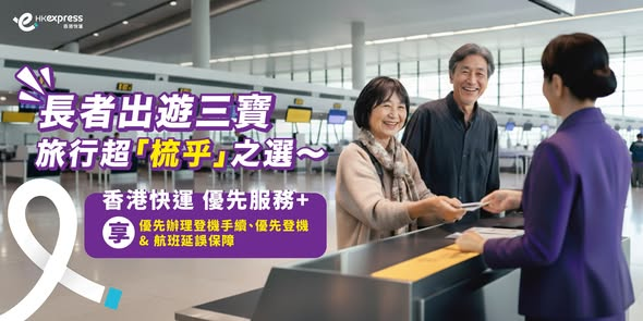 第一寶:加購香港快運 優先服務+,咁就可以享用優先辦理登機手續同優先登機服務,仲有航班延誤保障*,令旅程更有效率同埋畀自己安心~