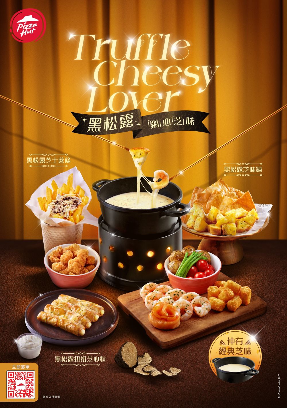 Hut年度「芝味鍋」季節!單純「芝」味已經滿足唔到你?由即日起至2026年1月28日,暖笠笠經典芝味鍋全面升級─ 黑松露芝味鍋華麗登場!四重芝士加入香噴噴黑松露,配上鮮甜大蝦、煙三文魚及香脆薯粒等全新豐富配料,不同口感的食材與黑松露芝士配合得天衣無縫,帶來更濃郁「芝」味!堂食惠顧*即可以港幣$104起追加芝味鍋套餐,最適合聖誕、新年帶摰愛「撐枱腳」,你一Dip、我一餵,享受令人心動的「鍋」心「芝」味!配上限定黑松露系列新品─ 黑松露扭扭芝心粒及黑松露芝士薯條,令今個冬天滿載黑松露滋味!同場加映冬日限定全新雲朵芝士炸雞及限時回歸的Hershey's邪惡朱古力軟心厚曲奇,連串驚喜讓你每個年尾節日大餐豪住食,暖住歎!