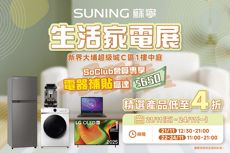 蘇寧為大家帶來秋日激筍電器優惠!蘇寧將於2025年11月21日至11月24日一連四天在大埔超級城C區中庭舉行《生活家電展》,涵蓋了電視影音,各式大小家電及手提電腦,會場更設有電器補貼優惠,蘇寧SoClub會員買家電產品滿指定金額即可享總額高達$650電器補貼,無論新居入伙添置新家電還是想升級家居電器產品,都可以於蘇寧大埔超級城家電展銷會盡情選購心水產品!