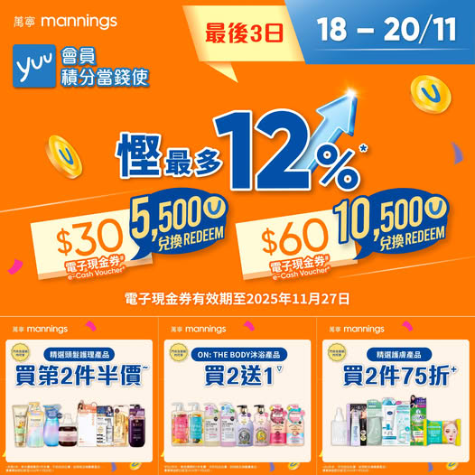 嚟到最後3日,想買日用品、美容同健康產品,一定係去萬寧門市入手,因為只要你係yuu會員,即日至11月20日期間,都可以用更優惠嘅yuu積分兌換萬寧電子現金券