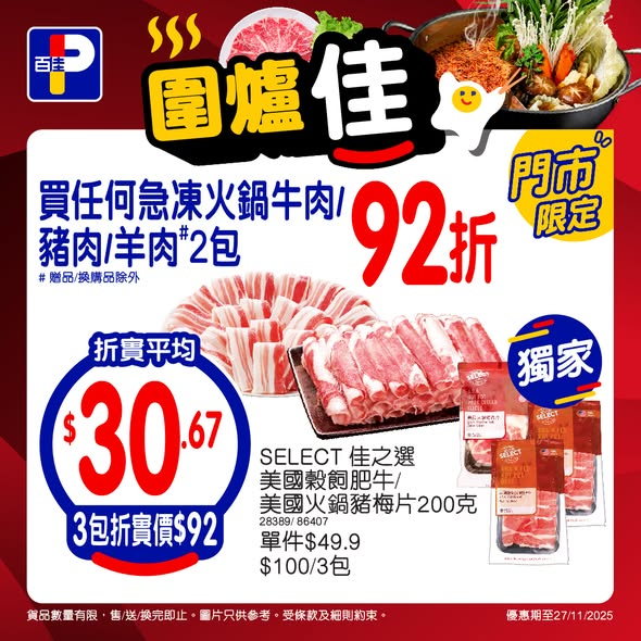 急凍火鍋牛、豬、羊任你揀,任選2包即享92折*