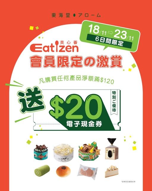 【超值回贈!】於11月18日至23日期間,凡於東海堂門市購買任何產品淨額滿 $120,即可獲贈 $20 電子現金券乙張!*