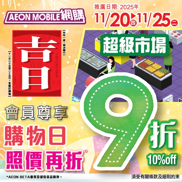*只適用於AEON Mobile網購。以上優惠恕不可與AEON DAY同時使用。優惠受有關細則及條款約束。