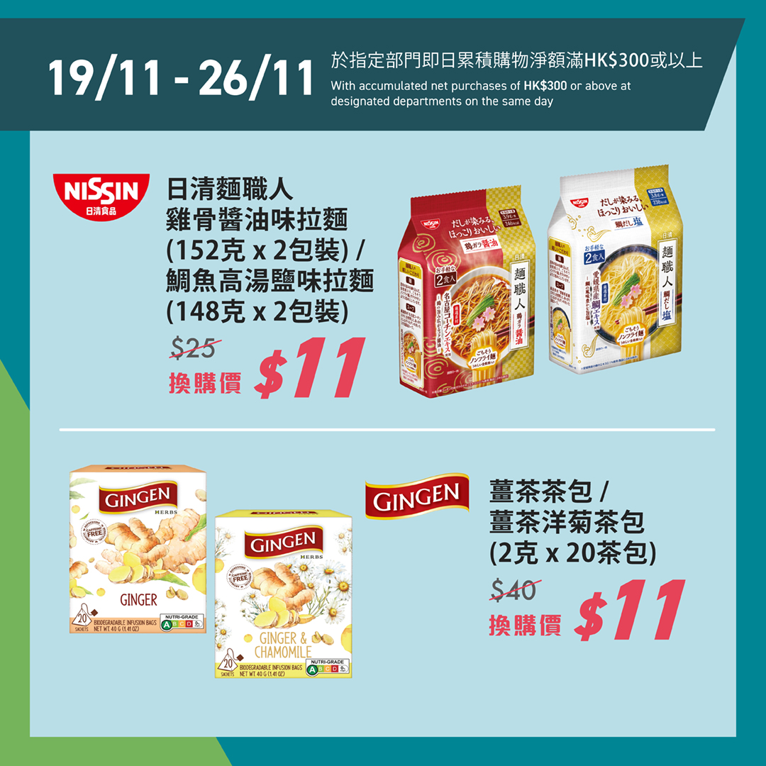$11激筍換購優惠】即日起至2025年12月4日,凡於指定部門即日累積購物淨額滿$300或以上,即可以$11換購指定貨品