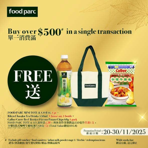 - 滿$500 送總值$95.8 禮品*,包括FOOD PARC TOTE & GO 迷你袋乙個 (價值$69.9),利休茶作茶類飲品550毫升任選1支 (價值$9),卡樂B港式咖哩牛腩味薯片68克1包 (價值$16.9)