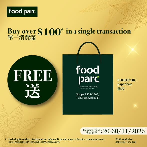 於FOOD PARC 單一消費滿:- 滿$100 送FOOD PARC 紙袋乙個 *